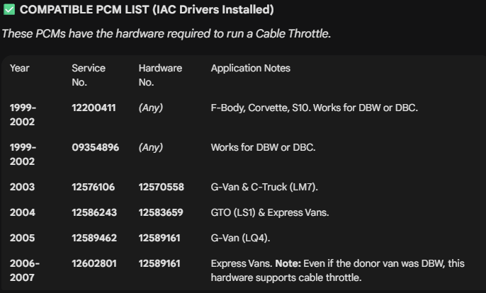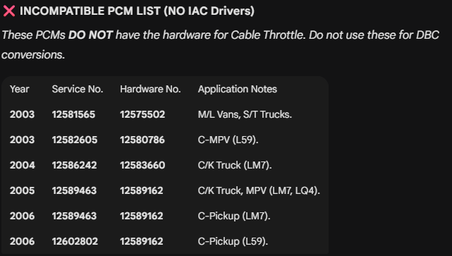 The Fix: You need a PCM from a 2004 GTO or a pre-2005 Express Van. Check the hardware numbers carefully against the compatible list—if the number is off by one digit, it won't drive the IAC.