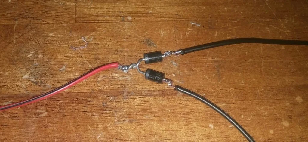 Solder one length of wire to the twisted end of the diodes (I used red wire), Then solder another length of wire to the other end of each diode (I used black wire). When done it should look like this: